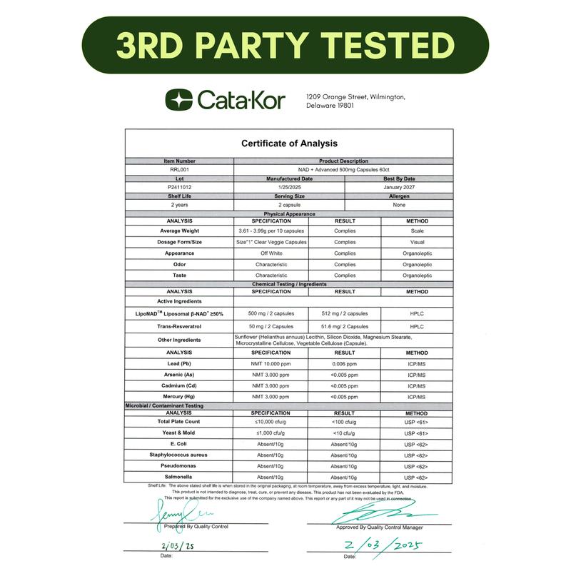 Cata-Kor NAD Advanced 500mg - NAD + Supplement for Skin Aging Support, Energy, and Focus - 60 Count - reviously known as Reus Research NR 900